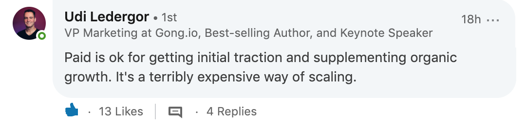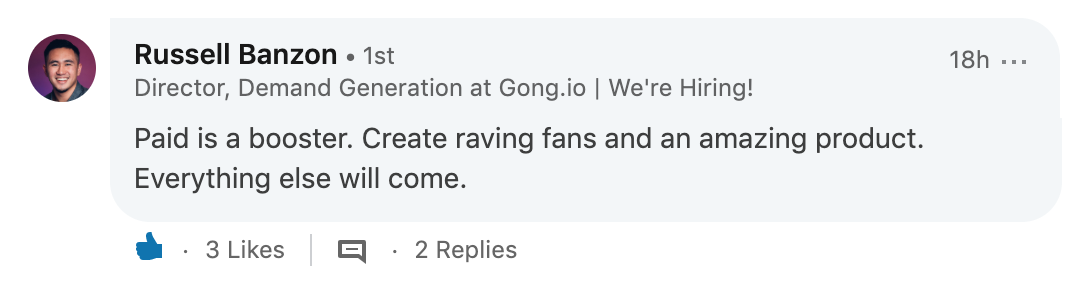 In the LinkedIn survey, Gong’s demand generation director Russell Banzon suggests paid traffic should only be a booster — while building a community of raving fans be the priority in the long run: