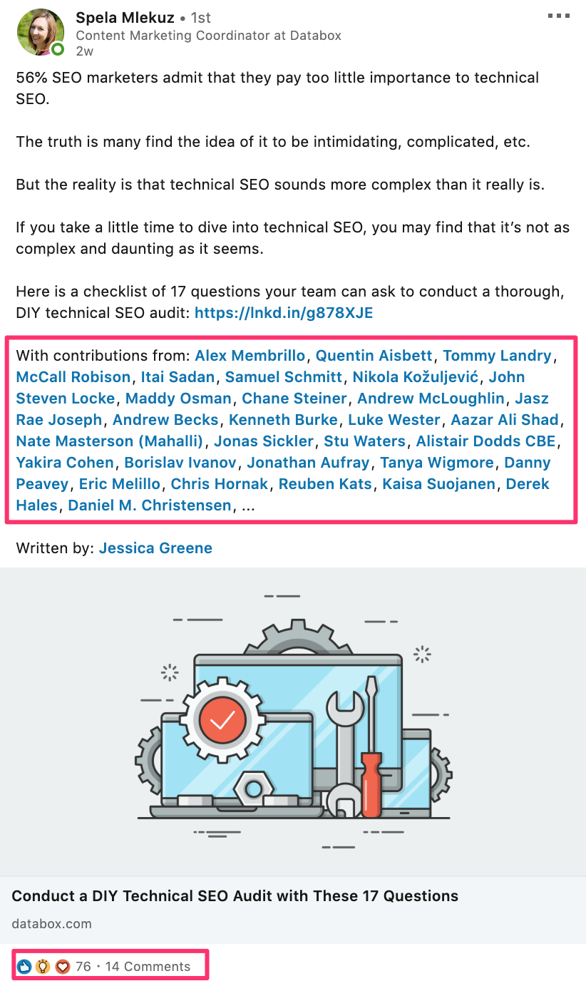 He added that most of their posts feature 50 to 200 experts. And for many of their posts, they tag the experts they’ve mentioned on social media, encouraging them to engage and amplify the content: