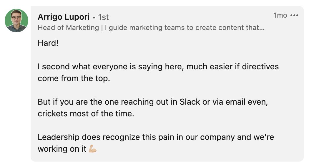 Multiple comments, like this one from Datavid’s head of marketing, quickly showed I wasn’t alone with my thoughts — collaborating with SMEs is easier when the directive to do it comes from above: