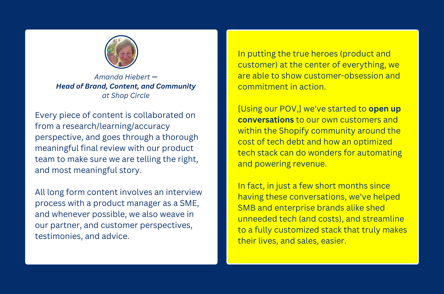 Shop Circle’s head of brand, content, and community — Amanda Hiebert — shared how their business model already presents an interesting POV/narrative.