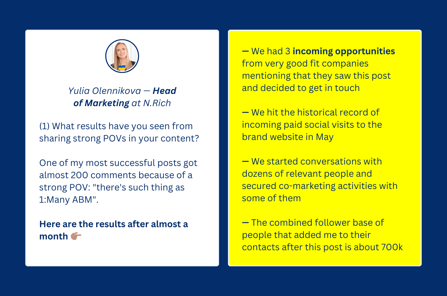 Yulia has been creating and sharing content with strong POVs around account-based marketing (ABM) on LinkedIn and has seen amazing results there.