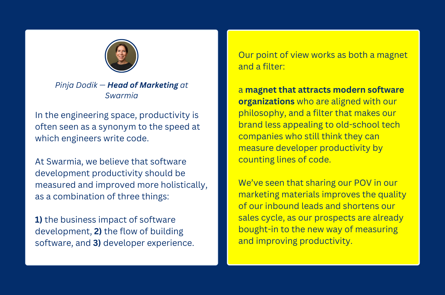 So when Swarmia’s head of marketing Pinja Dodik said “Our point of view works as a (sales) magnet…” I could immediately relate.