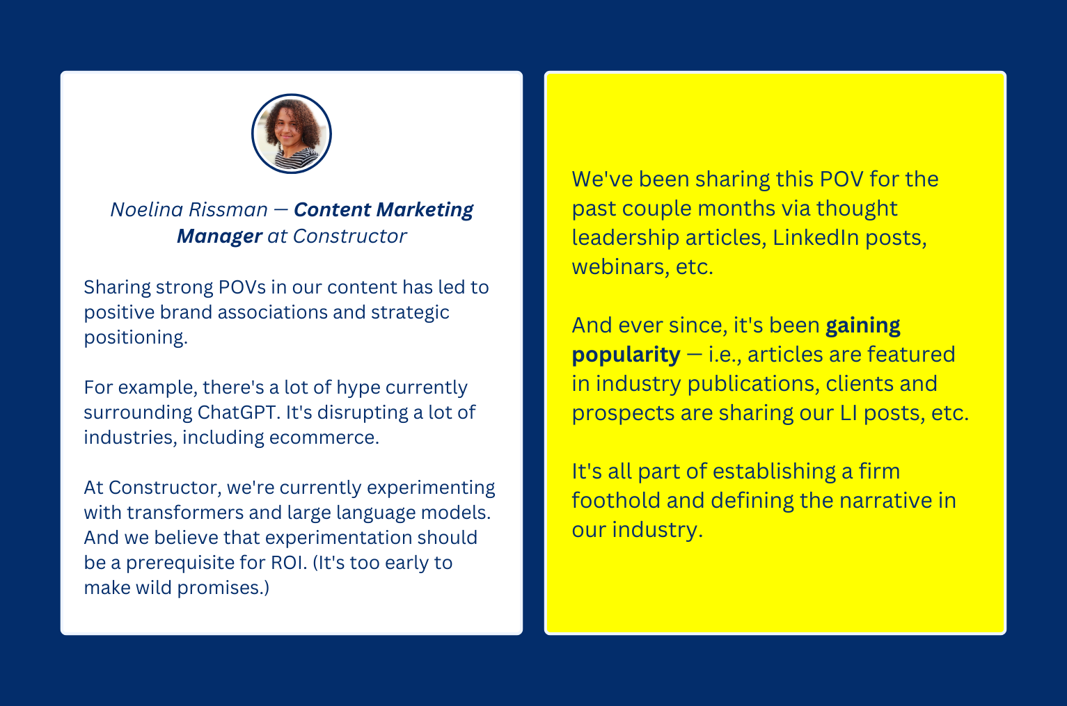 Noelina Rissman — Content Marketing Manager at Constructor — shared how they use POVs in their content to build popularity and credibility.