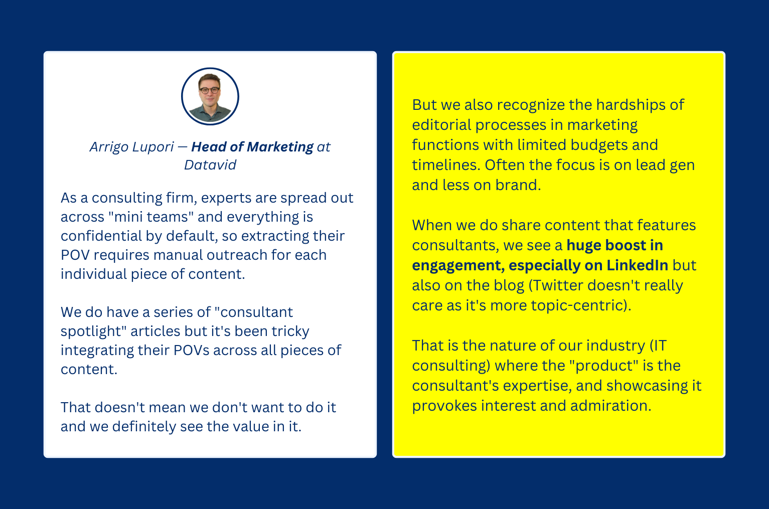 But when they do get the opportunity to share content that contains POVs from SMEs, Arrigo says they notice a huge boost in LinkedIn and blog content engagement.