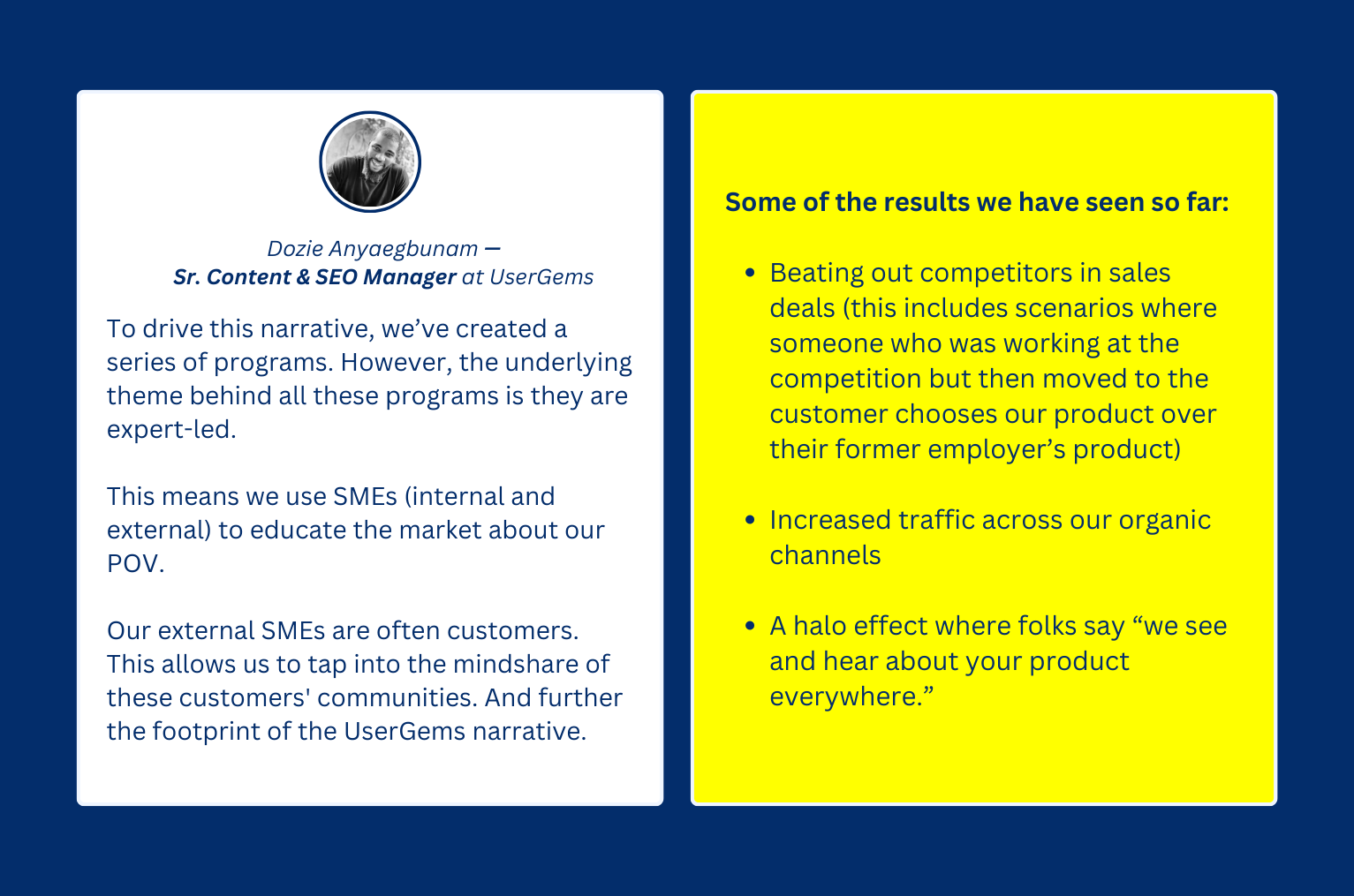 When I asked UserGem’s senior content and SEO manager, Dozie Anyaegbunam, if they typically use any brand POVs in their content and how they use it to drive results, he said: