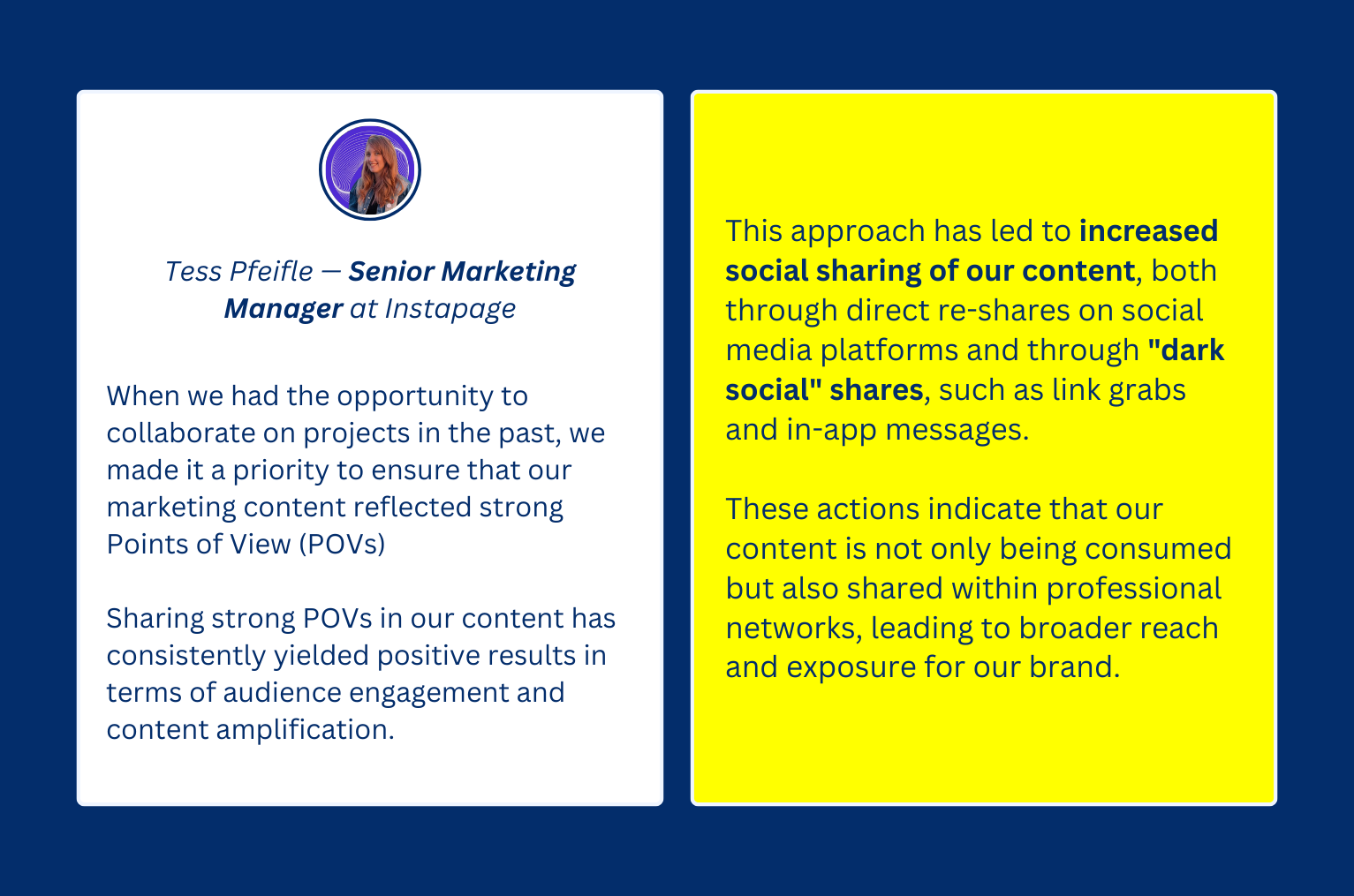 Instapages’s Senior Marketing Manager Tess Pfeifle shared that adding strong POVs to their content has led to an increase in both audience engagement and “dark social” shares.