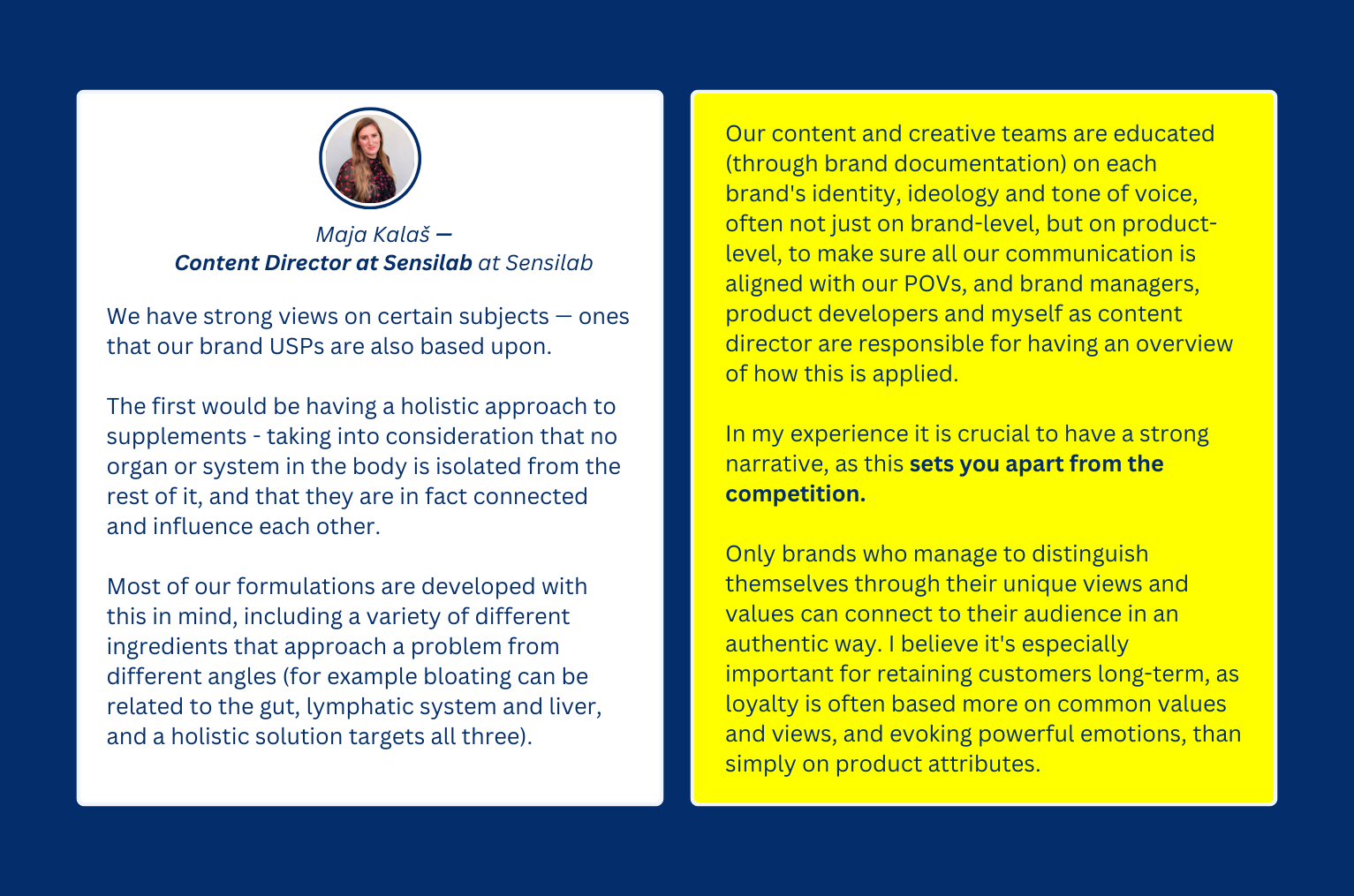 So when asked if there were any particular ideologies, narratives, or POVs she’s trying to push in the food supplements space for Sensilab, Maja pointed to their focus on preaching how consumers should be taking a holistic approach to supplements and why they should.