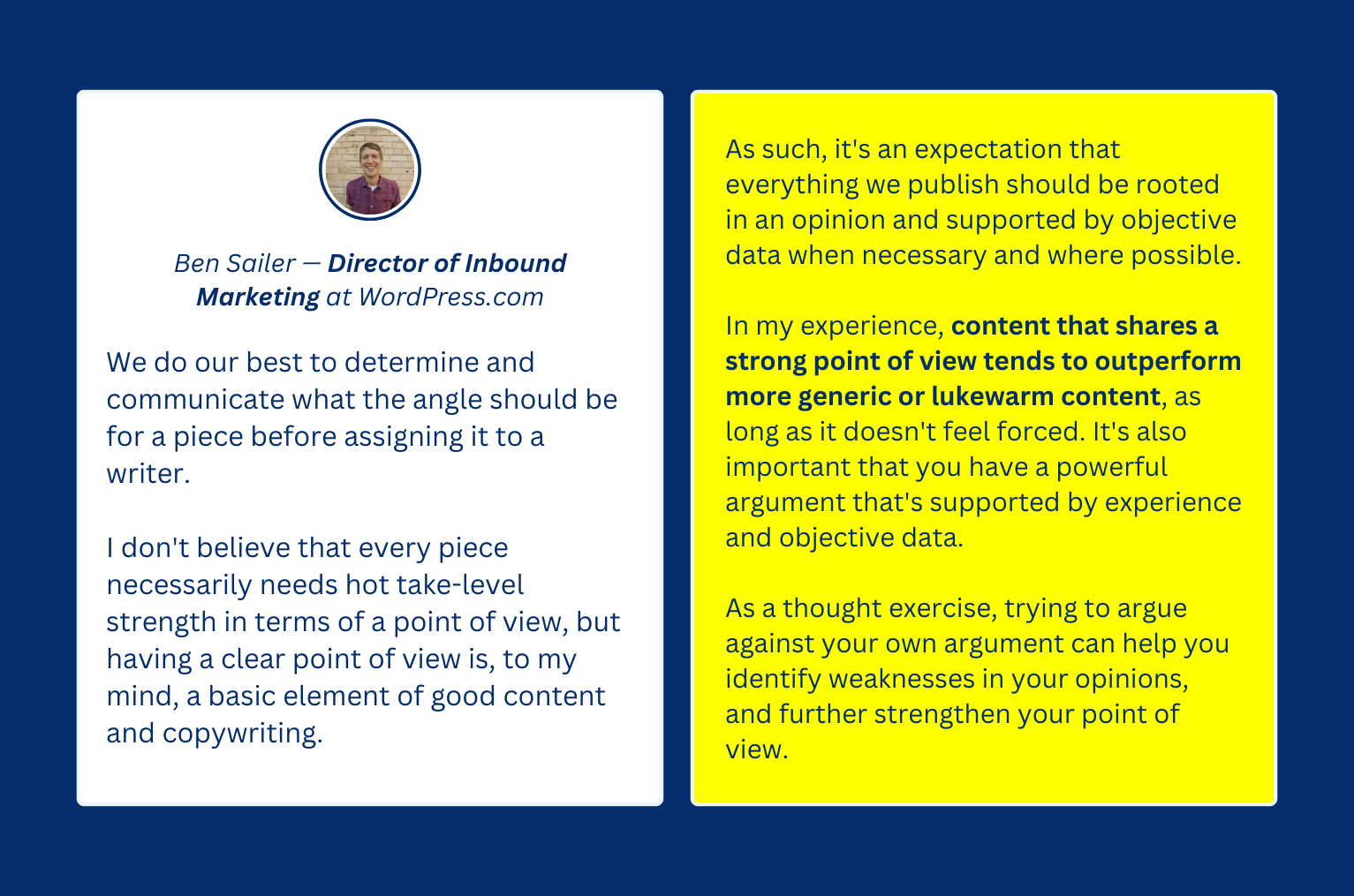 For WordPress.com’s Director of Inbound Marketing Ben Sailer, POVs help to create content that stands out from the generic, bland content that’s a dime a dozen in the website building space.