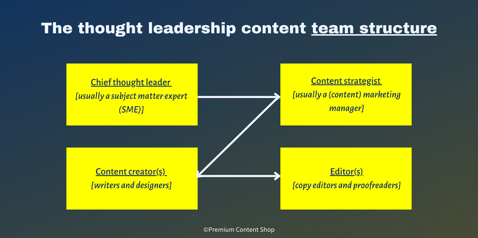 But if you’re doing it for a company, your thought leadership strategy would mostly need a team to execute it. For instance, this is the team structure Rennie (my partner) and I set up for each of our clients here at Premium Content Shop: