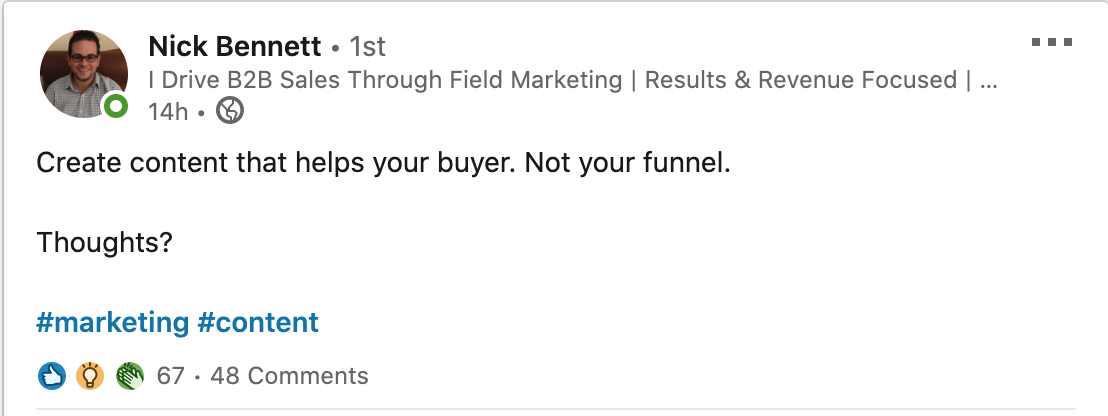 Nick’s right. As a marketer, you’re usually either creating content to send people into a funnel or you’re doing it to help your buyer.