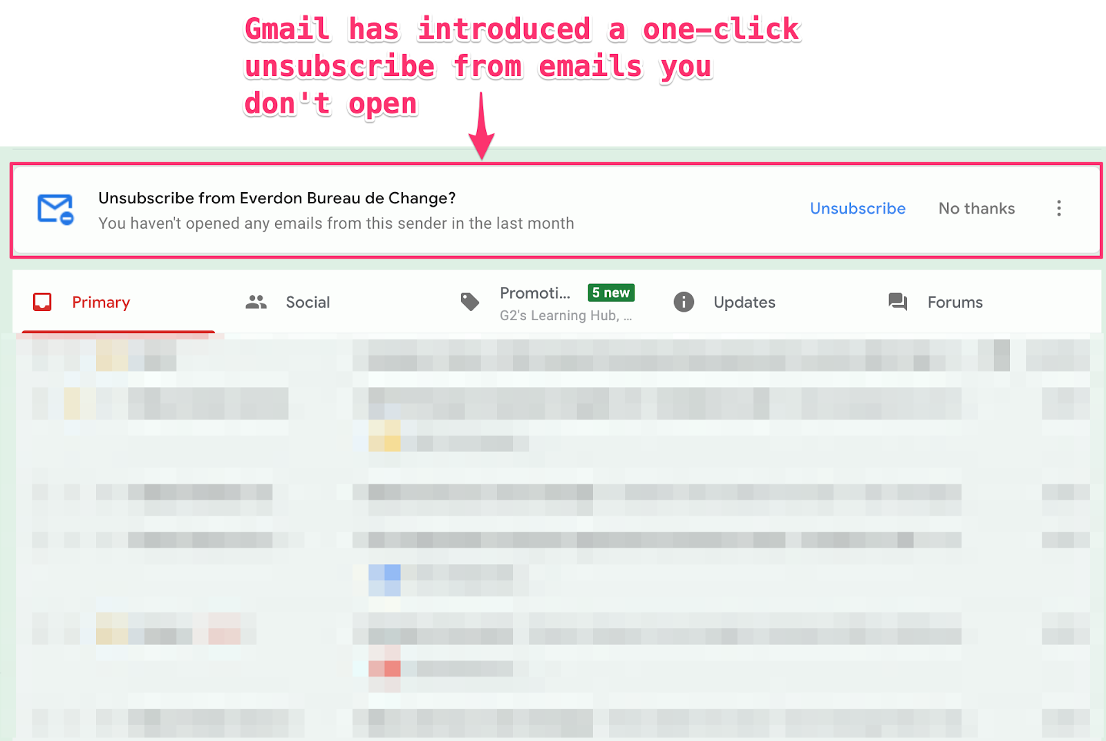 When Gmail notices you haven’t opened emails from a particular sender in a while, they’ll send you a one-click unsubscribe notification: