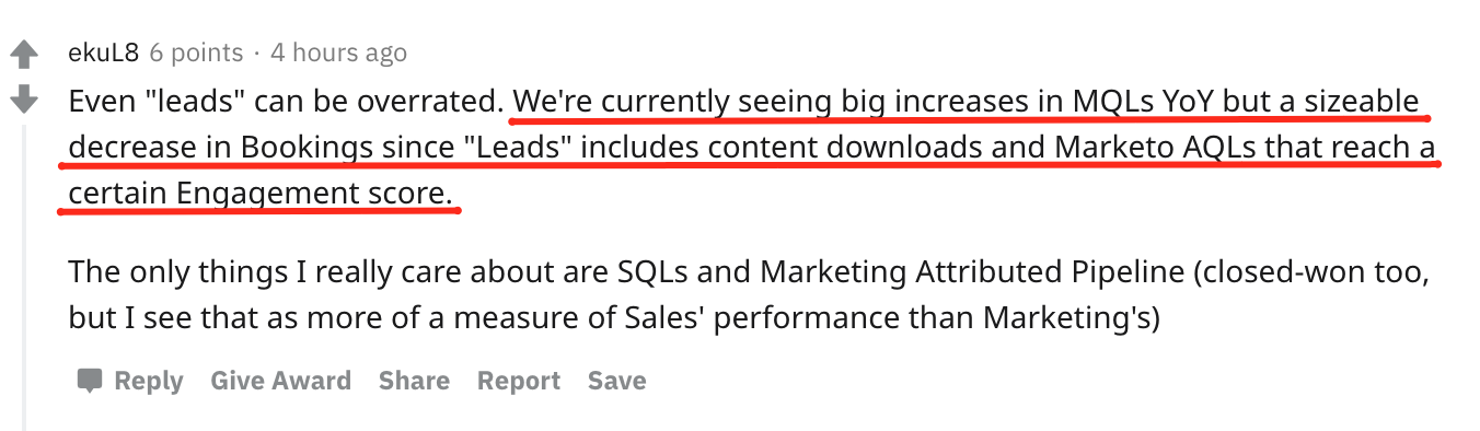 Another case in point: when a marketer on Reddit asked, “Experienced marketers –– which KPI’s do you find overrated?”