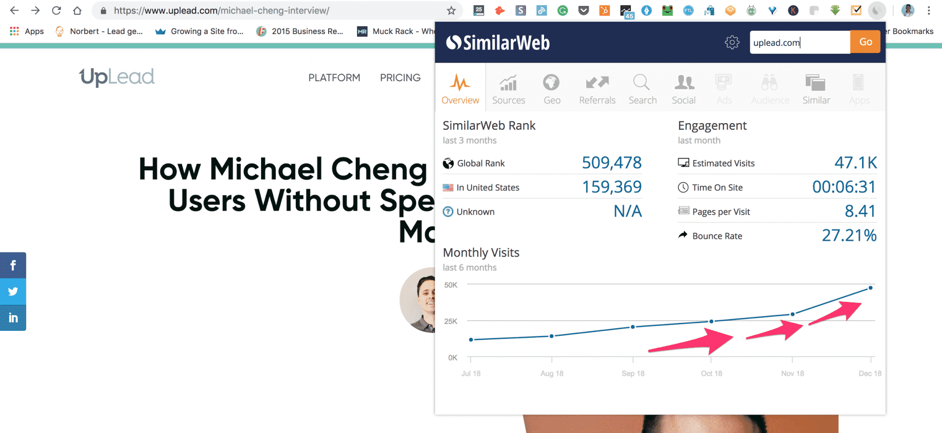 Using resource posts like those, coupled with in-depth stories on user acquisition and growth marketing, UpLead’s traffic has been climbing for the past six months (as of the time of this writing):